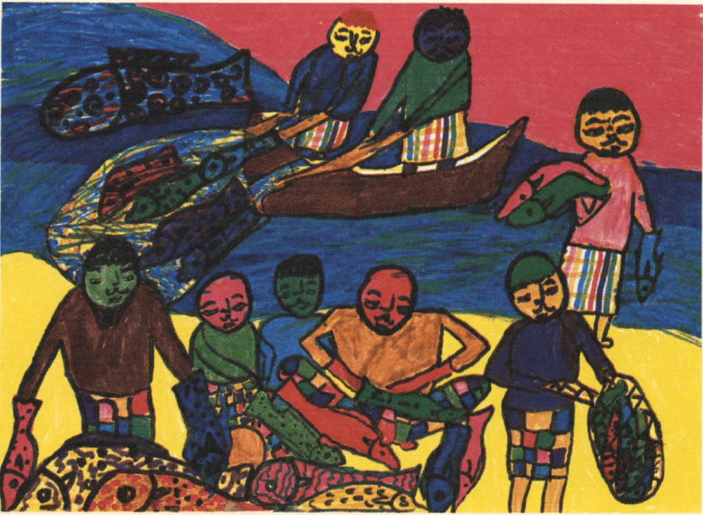 Look at the picture closely, and look at it from a distance. Notice the effect of the bright colors. Look carefully at the black lines—at the faces and fish and nets. One might say that, with colors, Halima tells the story of the bright hotness of the day. And, with lines, she tells another story—the story of the fishermen and the fish they caught that day.