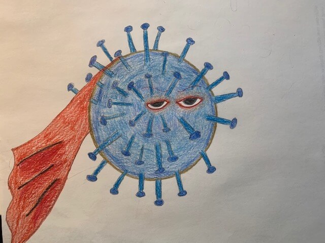 This drawing was made in response to our Daily Creativity prompt #73, in which former contributor Anna Rowell asked our readers to imagine what Coronavirus would look like if it were a supervillain, and what it would call itself.