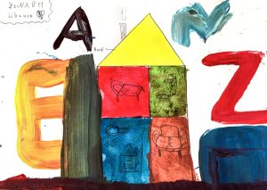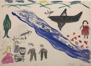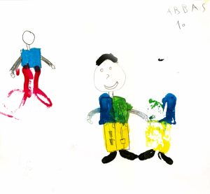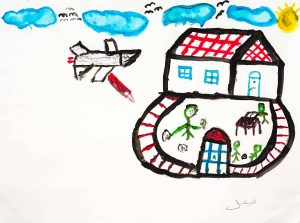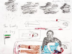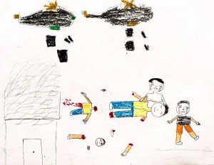 The boy's father was shot, and the red spots rare his blood against the wall and window of the house....