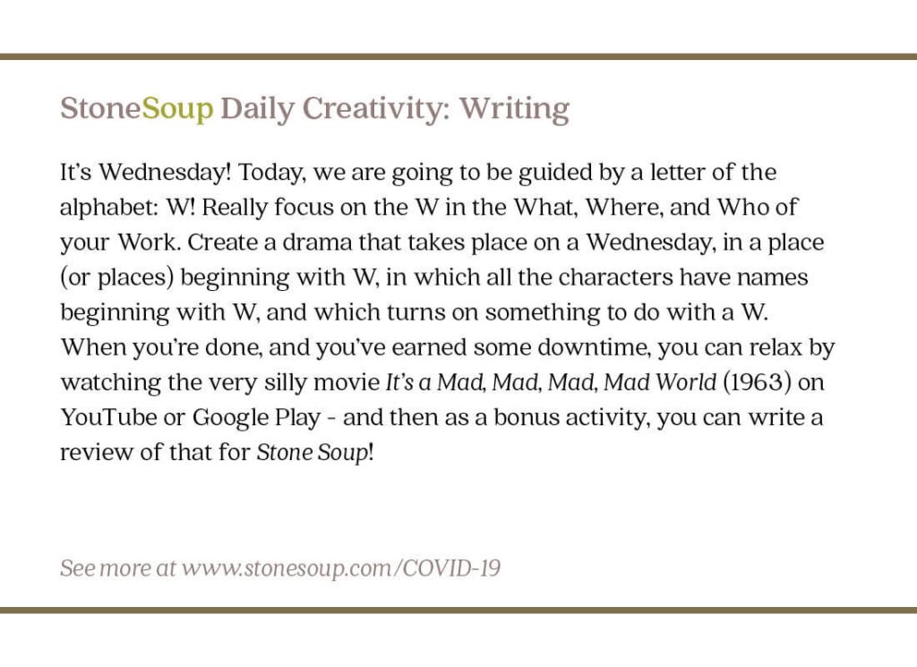When you’re done, and you’ve earned some downtime, you can relax by Watching the very silly movie It’s a Mad, Mad, Mad, Mad World (1963) on YouTube or Google Play – and then as a bonus activity, you can write a review of that for Stone Soup!