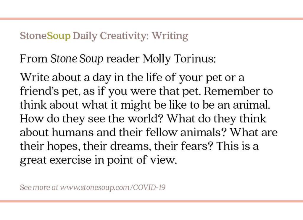 Editor’s note: For this week’s Daily Creativity prompts, we’ve got a special takeover! Molly Torinus, Stone Soup reader and contributor, has written the five prompts we’ll be posting for the week. For today’s, which is the week’s Flash Contest, she will also be co-judge!