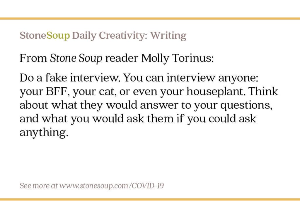 Do a fake interview. You can interview anyone: your BFF, your cat, or even your houseplant. Think about what they would answer to your questions, and what you would ask them if you could ask anything.
