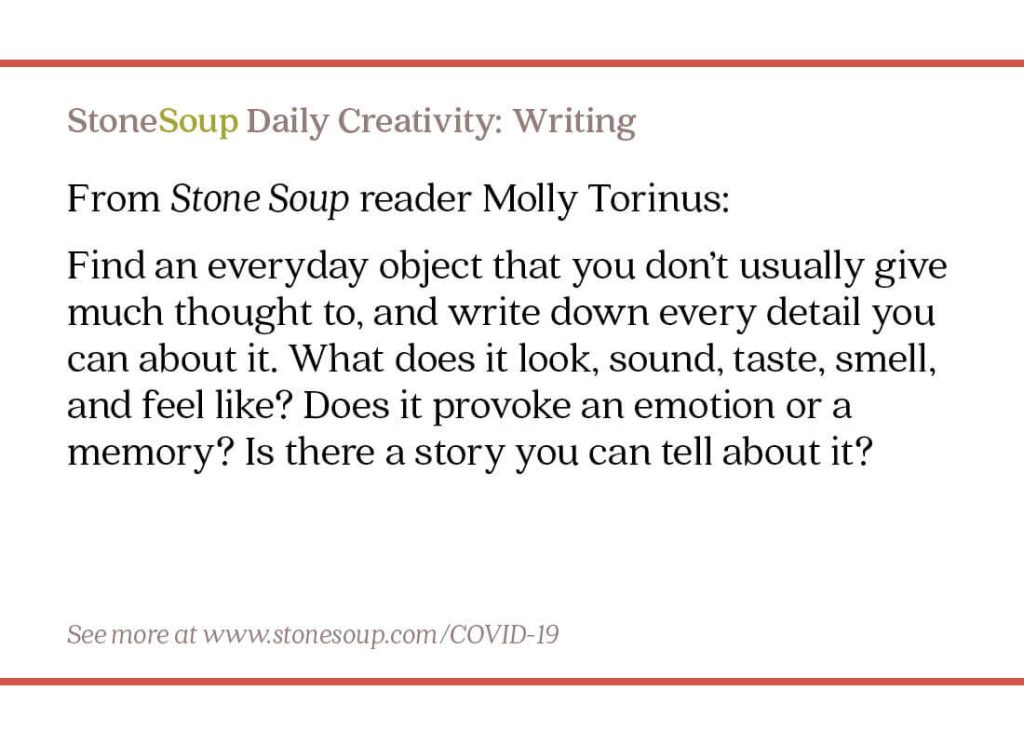 Find an everyday object that you don’t usually give much thought to, and write down every detail you can about it. What does it look, sound, taste, smell, and feel like? Does it provoke an emotion or a memory? Is there a story you can tell about it?