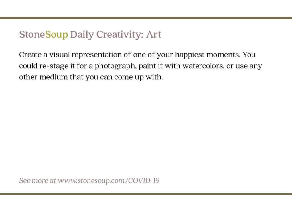 Today’s project is an art project. You can approach this project by being literal–you depict in a painting, drawing, or photograph exactly what you are remembering. But it is also possible to approach this more impressionistically–a sky full of fireworks, a flying bird, a lovely flower, might be ways to express the right feeling of happiness that the moment made you feel.