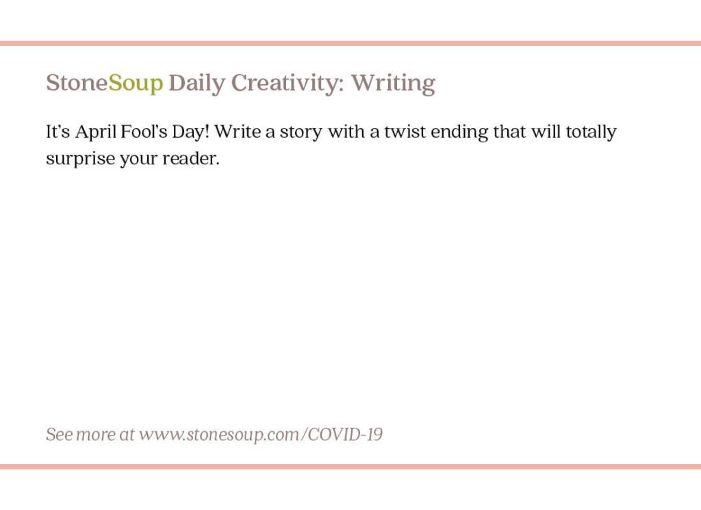 Daily Creativity #8: Write a Story with a Twist Ending Published April 1, 2020 It’s April Fool’s Day! Write a story with a twist ending that will totally surprise your reader.