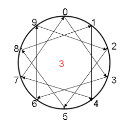 Things start to look more interesting when you do the 3 times table. Always start at 0. Draw a line from 0 to 3, 3 to 6 {3 x 2 = 6}, 6 to 9, 9 to 2 because 3 x 4 = 12 and the last digit is 2, 2 to 5, 5 to 8, 8 to 1, 1 to 4, 4 to 7, and 7 back to 0. Your picture should end up looking like this: