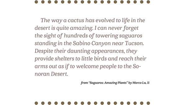 The way a cactus has evolved to life in the desert is quite amazing. I can never forget the sight of hundreds of towering saguaros standing in the Sabino Canyon near Tucson. Despite their daunting appearances, they provide shelters to little birds and reach their arms out as if to welcome people to the Sonoran Desert.
