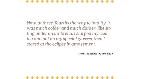 In an explosion of light, the sun and moon seemed to pop out, then arranged themselves into a beautiful, shimmering, ghostly ring. Everyone around me cheered. My dad took pictures by putting his glasses onto his camera lens. I could not believe it.