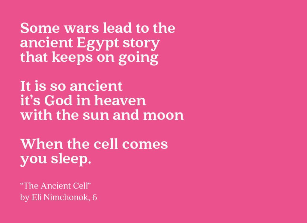 The Ancient Cell by Eli Nimchonok Published October 18, 2020 Some wars lead to the ancient Egypt story that keeps on going It is so ancient it’s God in heaven with the sun and moon When the cell comes you sleep. Eli Nimchonok, 6Toronto, Ontario, Canada