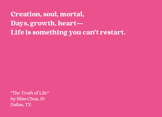 The Truth of Life by Bliss Chua Age 10 Published May 1, 2022 Creation, soul, mortal, Days, growth, heart— Life is something you can’t restart. Bliss Chua, 10Dallas, TX