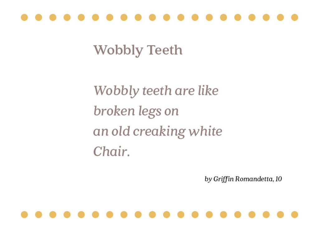 Wobbly Teeth by Griffin Romandetta Published October 12, 2019 Wobbly teeth are like broken legs on an old creaking white chair. Griffin Romandetta, 13Apex, NC