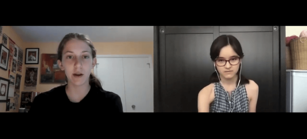 Stone Soup contributor and 20-21 intern Anya Geist, 14, talks with three time winner of the Weekly Flash Contest Enni Harlan, 13, about writing a novel, the research that goes into historical fiction, and the feeling of living in your story.