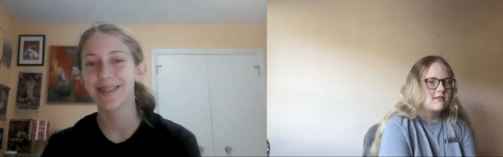 Stone Soup contributor and 20-21 intern Anya Geist, 14, talks with Stone Soup newcomer Katie Pausin, 11, about her unfinished picture book about a traveling penguin, how Erin Hunter’s Warrior Cats series inspires her to write in different points of view, and the importance of quiet in breeding creativity.
