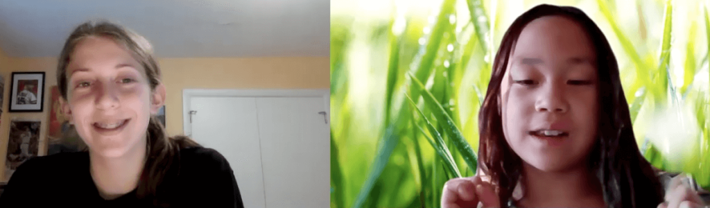 Stone Soup contributor and 20-21 intern Anya Geist, 14, talks with third place winner of the 2019 Book contest and winner of the Weekly Flash Contest Nami Gajcowski, 10, about how it felt to finish her novella, Elana, how she decided on its fantastical elements, and the innovative inclusion of emojis.