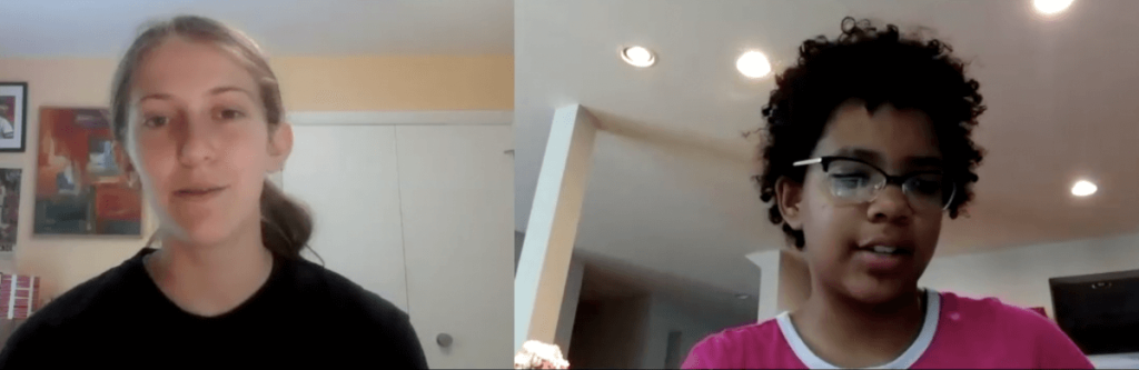 Stone Soup contributor and 20-21 intern Anya Geist, 14, talks with Stone Soup newcomer Shelby Miller, 11, about the inspiration she gets from her author grandfather, writing scary stories, and the lovely privacy of writing in her own room.