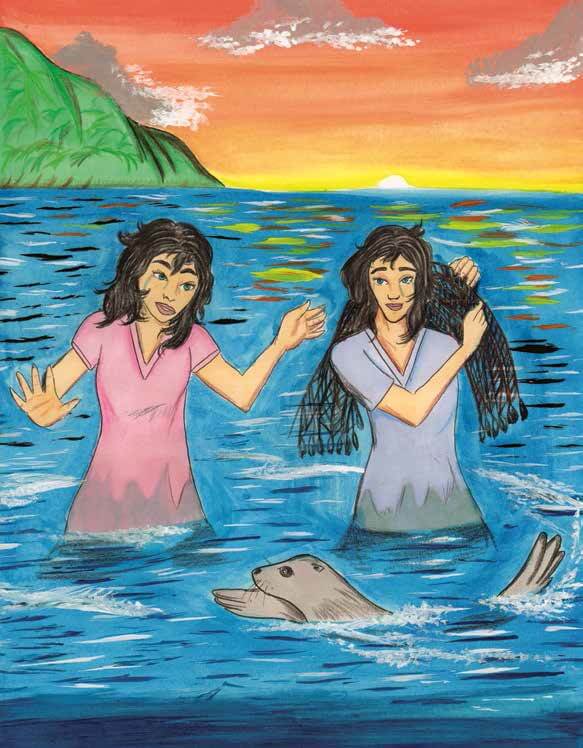 In the blackness of night, they make out a dark shape, thrashing in the water. They splash through the waves and discover . . . a seal, caught in a fishing net, desperately trying to get free. The girls look at each other. The seal looks at the girls. They know what they have to do. For several hours they steadily work at the net, pulling it apart little by little. They are cold and wet, but they don’t care. They don’t stop until the seal is free. The girls head home, exhausted but happy.