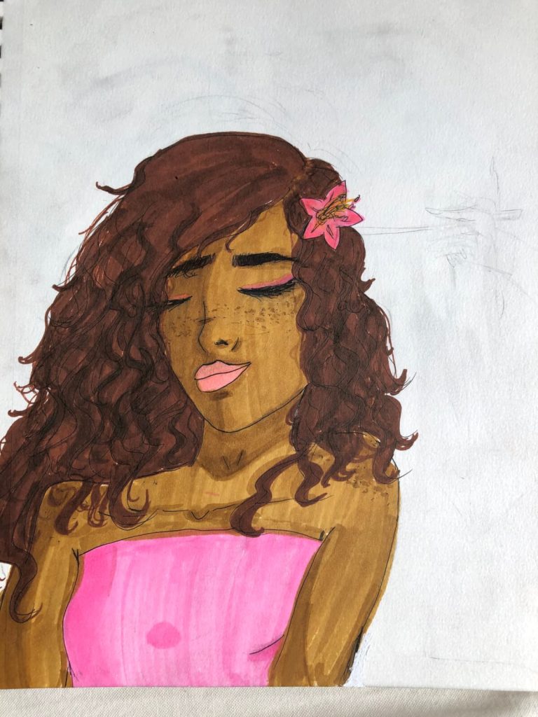 This piece depicts a girl, her eyes closed, and her lips are smiling. I like to think that she is almost dreaming. A good dream. This piece was again done with alcohol markers.