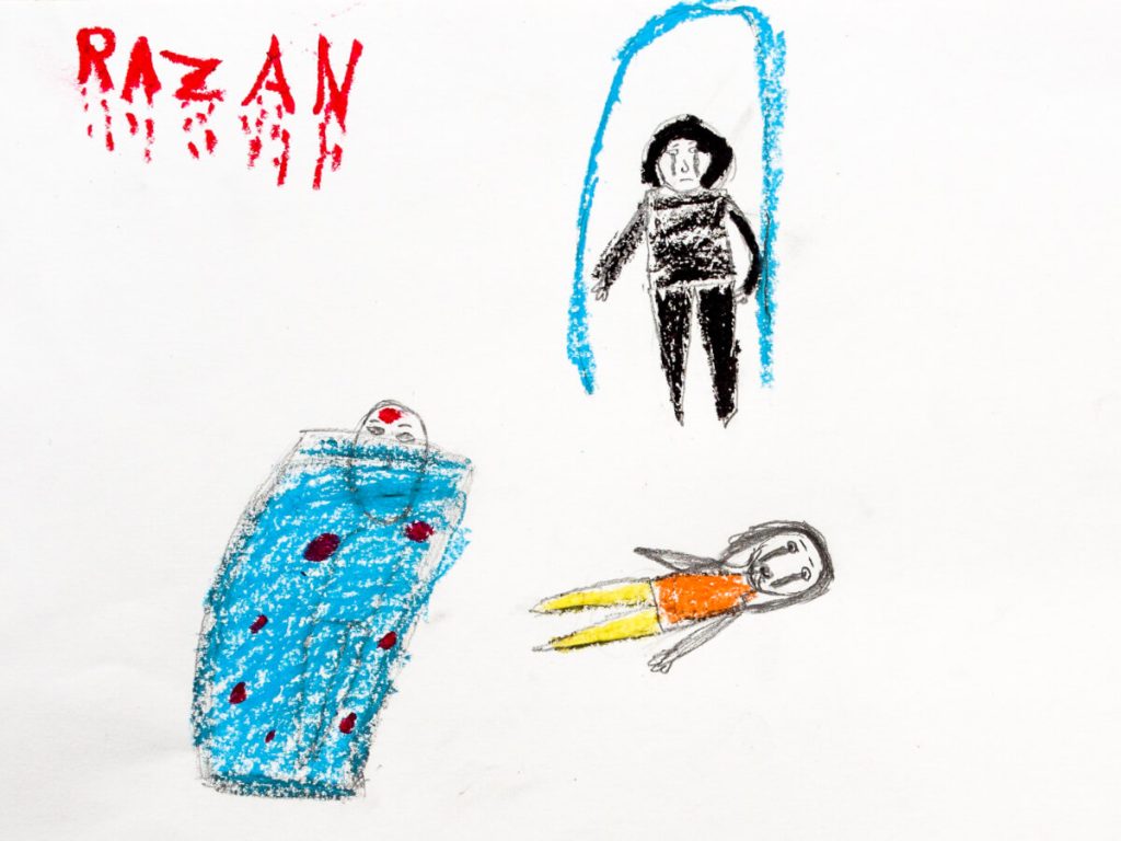 A mother comes into her house to find her son dead in the bed, riddled with bullets. The other child is crying. “Razan” is the artist’s name (at the top). Bleeding objects are very common in the children’s drawings.Topic for this session: Dealing with loss.