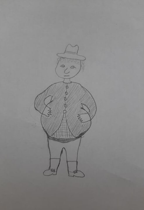 He dressed in plain clothes, but he never seemed a beggar; he wore a crumpled shirt inside and a leathery vest over it, his almond-green pants slightly bigger than he really was. His shoes were old and worn, the buckles rubbed with dirt and the soles thinner than paper. He always had a hat on, in a cowboy style, though no one really knew what he did in the old days. He was a fat old man, and his belly bulged and, in a peculiar way, hung downwards.