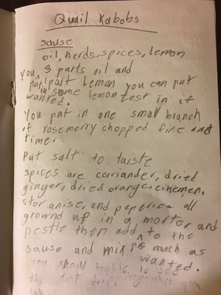 Quail Kabob ingredients. The recipe is by a nine-year-old.