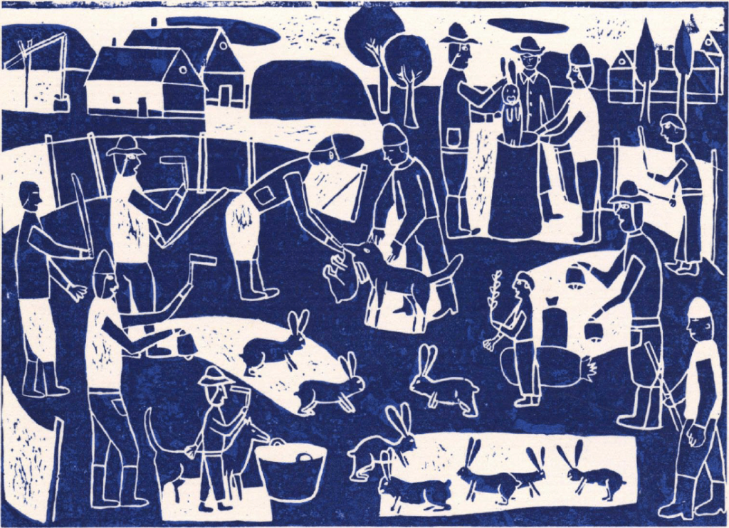 Like Katalin, make a drawing in one color. Katalin’s picture is a linoleum print or lino cut, but you will probably use pencil or pen. For a subject, choose something where lots of people (at least six) are doing something active. Following Katalin’s example, capture the movements of each person in the scene at the moment you freeze the action.