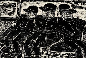 This extraordinary selection of woodcuts is from a single school in Japan. We are not certain when they were made. We have had them for more than thirty years. Our guess is they date from the 1970s. Each print is a powerful work of art, and taken together they represent a staggering display of masterful woodcuts by students ages 12 to 15. The self-portraits are strikingly focused.