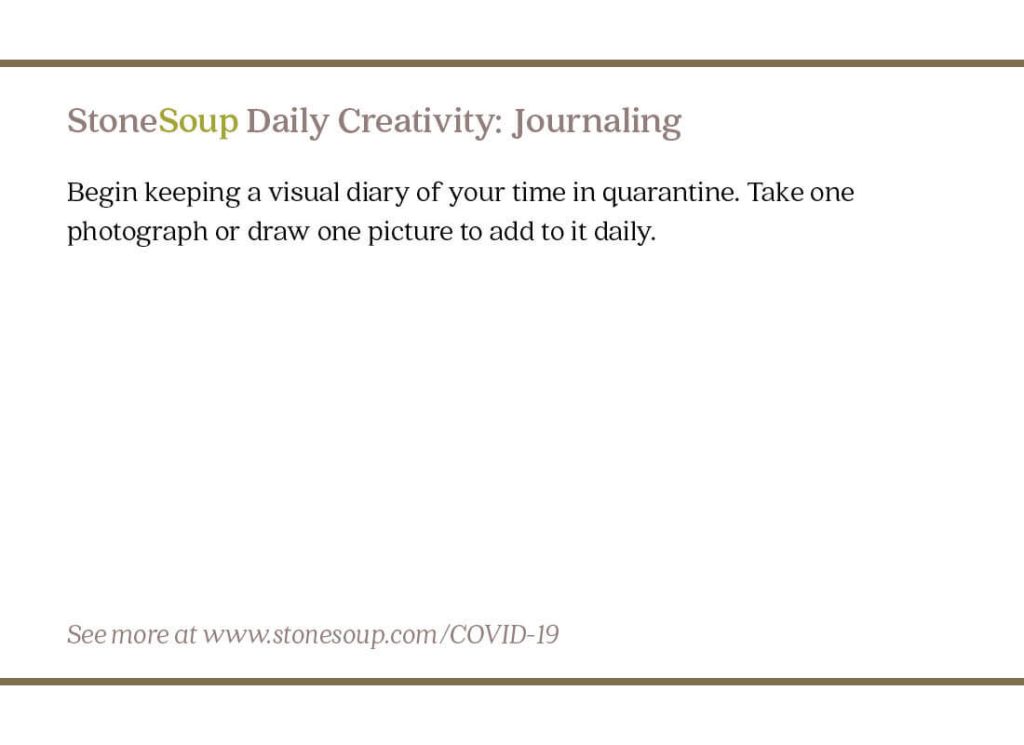 Daily Creativity #7: Keep a Visual Diary By Published March 31, 2020 Begin keeping a visual diary of your time in quarantine. Take one photograph or draw one picture to add to it daily.