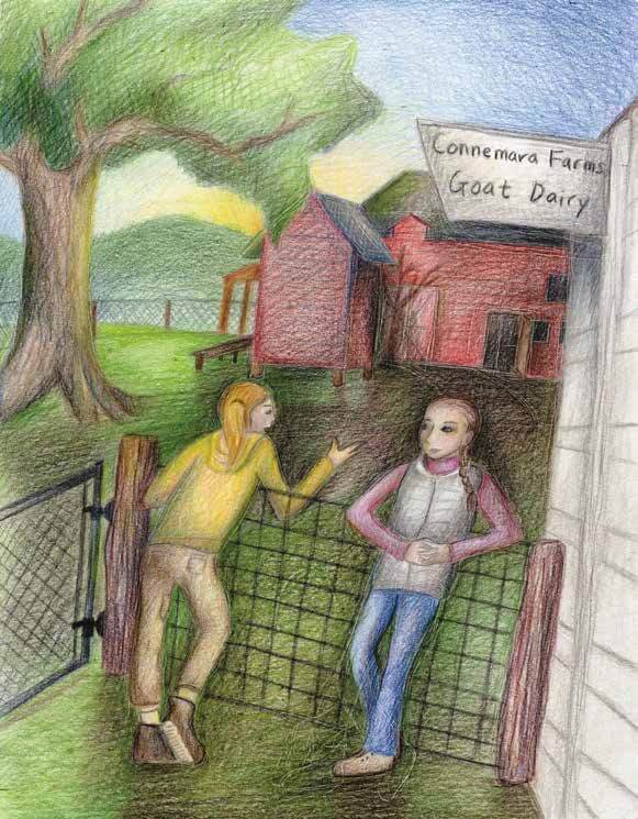 There’s the narrator, Christy, a young woman who works at a goat farm. From the first sentence, we see that Christy loves nature. As the story goes on, we learn that she is emotional, loving, and a bit of a worrier. Christy’s co-worker, Marla, seems kind of slow at first. Little by little, we see that, while Marla may not say much, she is wise, and she feels things deeply. Their boss, Jenny, is a take charge kind of person, full of confidence. But she has a soft side and feels sad, like Christy does, when Barney the goat has to leave.