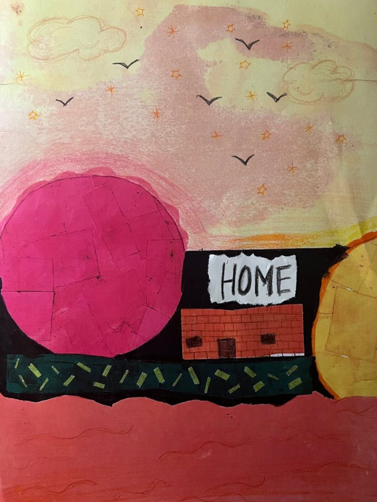 I chose this piece of art, called “Full pink sun half a yellow sun,” to add to because from the moment I looked at it, I could already see the many similarities between the shapes and colors used in the artwork and videos of the Kakuma refugee camp that I watched. I interpreted the small orange rectangle as a representation of their homes, so I added the tiny brick details, as well as the door and windows. I pictured the long green rectangle under the orange rectangle as grass. So, I cut out really small green rectangles out of images of grass from magazines and scattered them all over the green area. The orange-brown area under that had a wave-like pattern on top, so I drew on some waves all throughout that space. I also added clouds, stars, and birds to the sky above. The big pink sun and half of the yellow sun definitely stand out, so I added some color around them and then basically connected the colors to act a metaphorical bridge between them to signify togetherness, family, and the strong community inside the refugee camp. And finally, I wrote “HOME” on a piece of paper, that I placed above the representation of their homes, to show that the Kakuma refugee camp is, and has been the home for most of all the Kakuma refugees’ lives. I tried to highlight and emphasize this image/concept without adding too much to the artwork and to honor the original artist’s intention and purpose of this piece of artwork.