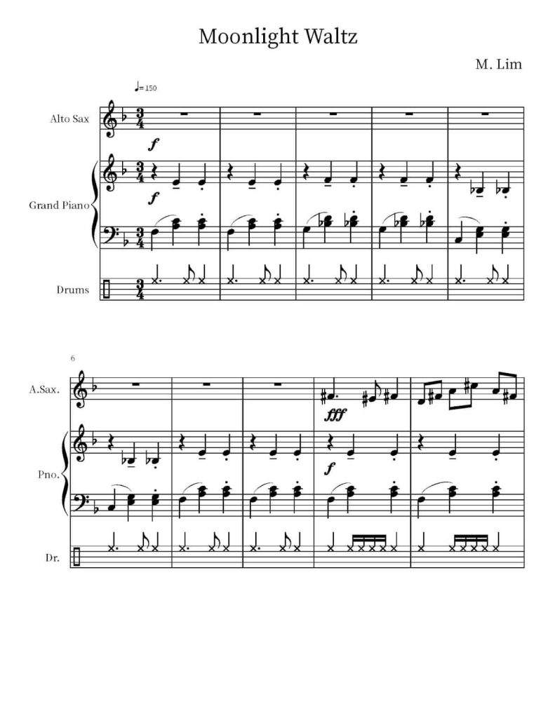 “Moonlight Waltz” is a new piece written for piano, saxophone, and drums. I was inspired to compose this when I started learning about jazz style. I wanted to incorporate some of the things I learned to compose a waltz. It is called “Moonlight Waltz” because I imagine dances under moonlight to be very beautiful.