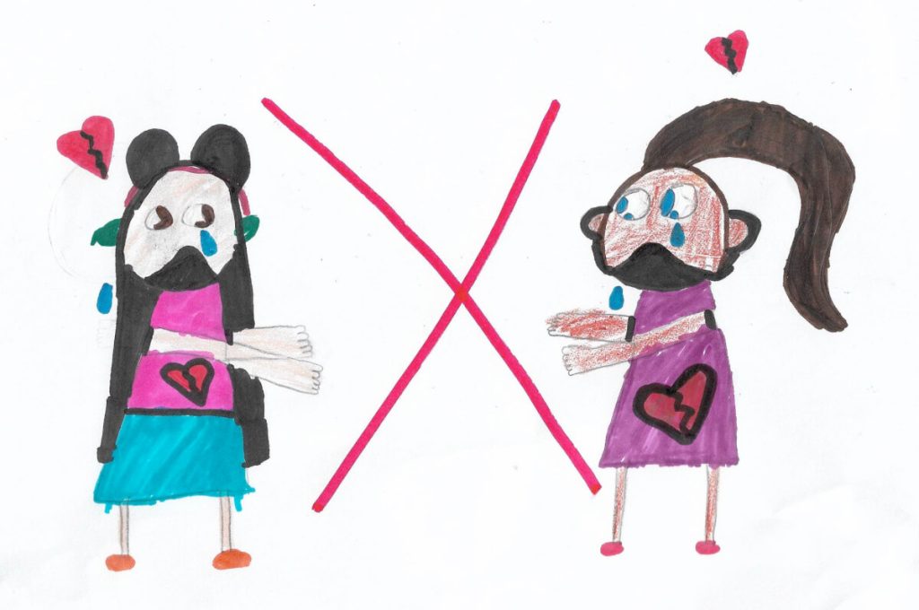 Pandemic Prohibitions, a drawing by Leila Ortiz, 8 by Stone Soup Editors Published June 8, 2020 Leila Ortiz, 8Brooklyn, NY Pandemic Prohibitions Leila Ortiz, 8 In this drawing there are 2 best friends wanting to hug each other but they aren’t allowed due to CoVid19. Pandemic Prohibitions, by Leila Ortiz, 8