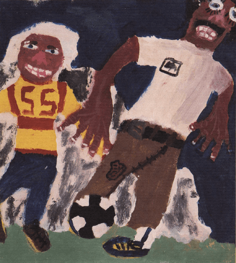 This picture is from New Zealand. Brett Penman, age 10, shows us what it feels like to play soccer when the ball is moving fast and both teams are on the run. To get across the tension, speed, and emotional feelings of being on the field playing a hard game, Brett depicts the players as big, bold, and wild. The boldness of the picture matches the boldness of the game.
