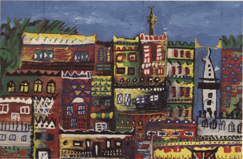 This photograph is of Sanaa, the capital of Yemen. The buildings are made of brick or mud brick with white decorations made of white paint. This architecture is similar to that depicted in the painting of Al Aflaj, Saudi Arabia made by Khaled Abdulaziz Ateeg, 12. Khaled’s painting was made in the 1970s. Judging by images that I find online I think that this is not what the Al Aflaj looks like today. In the painting, the town is still a city of traditional buildings. They will have been smaller than the ones you see in the photograph of Sanaa. And they will have been of adobe–of mud bricks. What is remarkable about Khaled’s painting is that the architectural style is clear–and at the same time he has had the courage of an artist to present the town as richly colored. Realistic. But also imaginative.