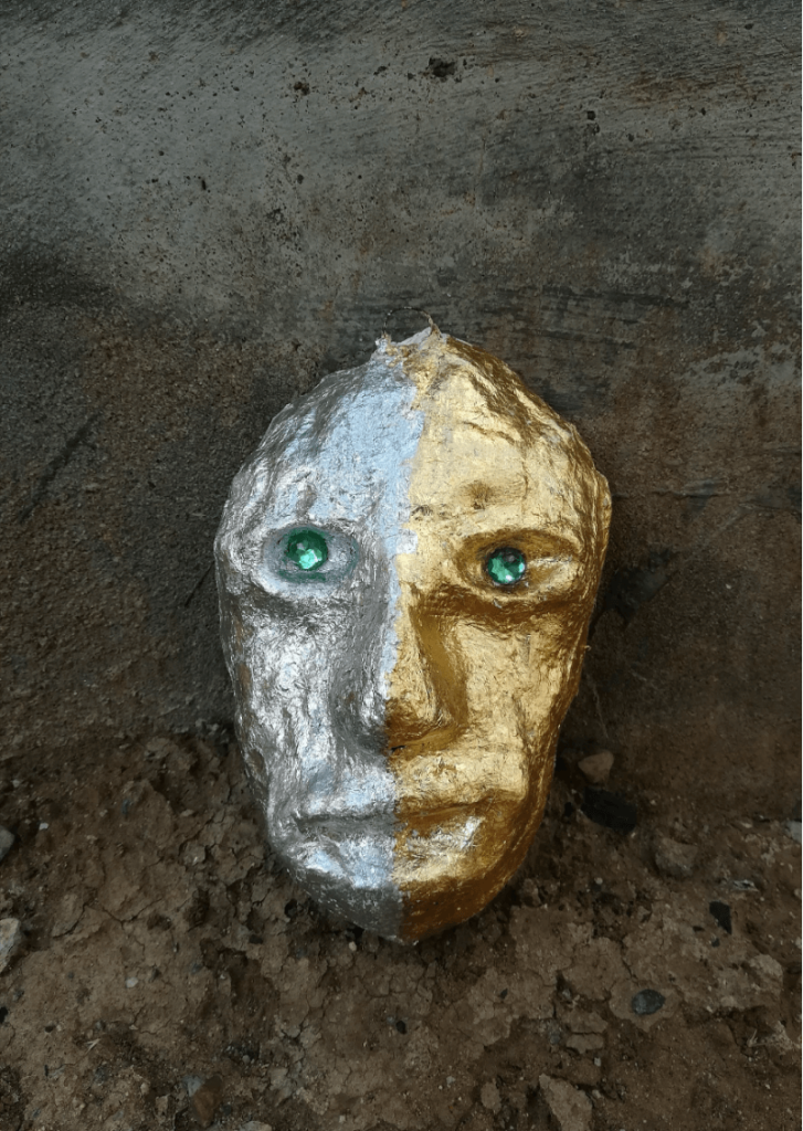 Undisovered Treasure by Emma Birches Published January 1, 2021 Paper Mache mixture using ripped up old school exercise books, gold leaf, sequins