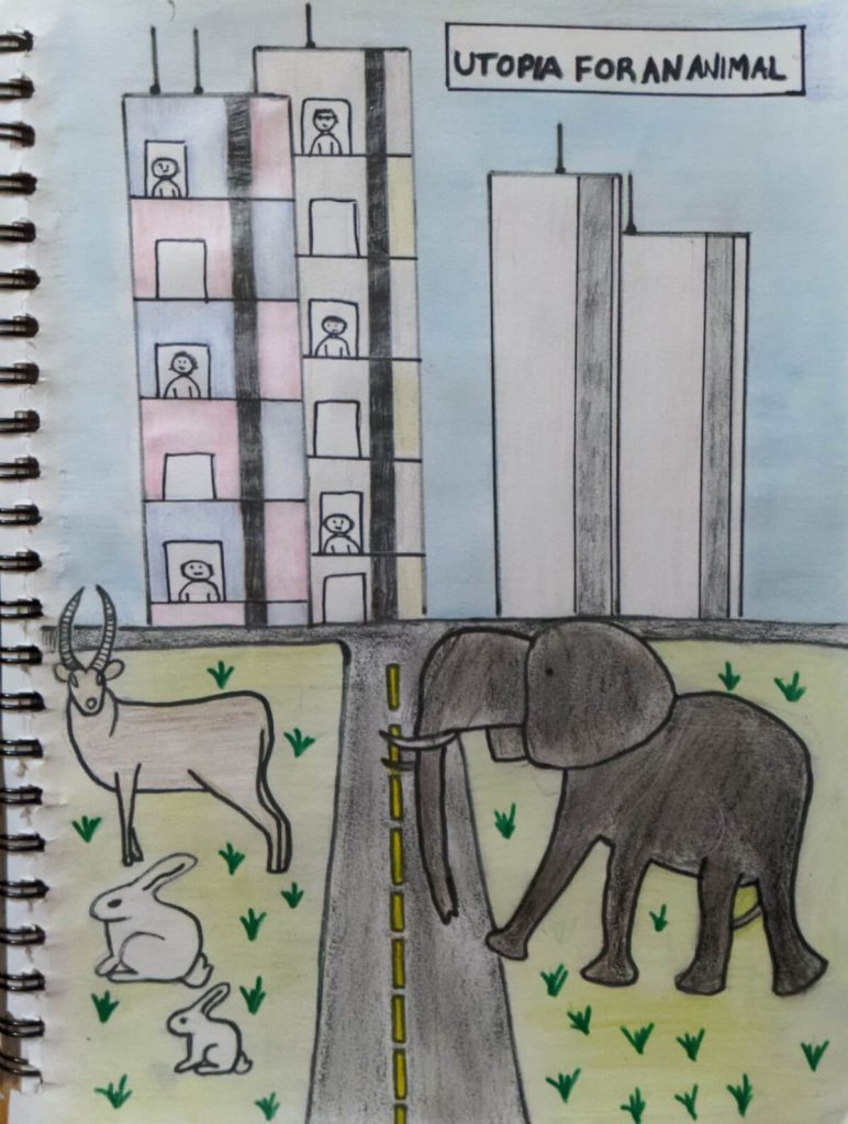 “Utopia for an Animal” is a pictorial representation of how the coronavirus has changed our lives. As depicted, humans are stuck inside their homes and apartments, as animals outside frolic and play in an area of little to no pollution, and no hindrance to them. Elephants cross the street, antelopes look around, and bunnies and their families dance and eat grass. Utopia is a perfect society. For animals of all domains and kingdoms, this is the Utopia they would never have gotten anywhere else. Covid-19 has influenced our lives very much and changed the world to a great extent, but on the other hand there are animals, just waiting for this opportunity.
